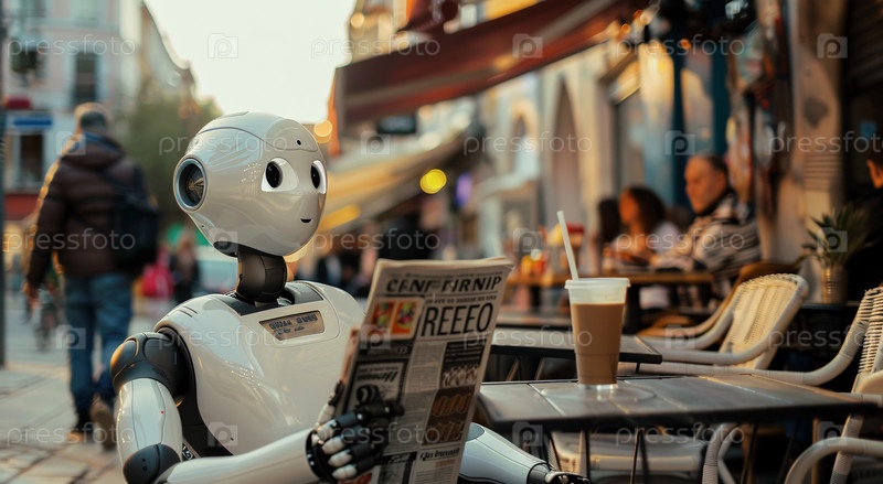 Робот сидит за столиком уличного кафе, читает газету и наслаждается чашкой кофе в спокойной обстановке