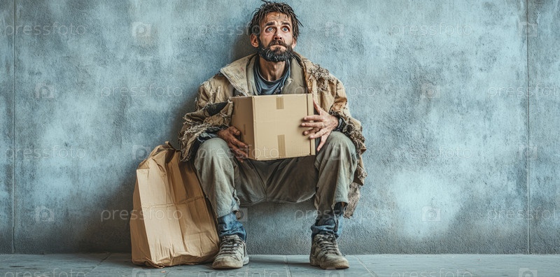 Мужчина держит картонный плакат, сидя у бетонной стены, что означает мольбу о помощи