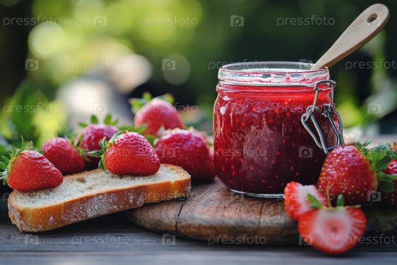 Деревенская обстановка на открытом воздухе, где на деревянном столе представлена свежая клубника и домашнее варенье в сочетании с хрустящим хлебом