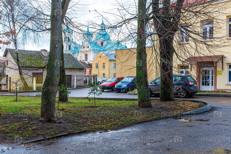 Городская улица с деревьями, припаркованными автомобилями и зданиями, на заднем плане — историческая церковь