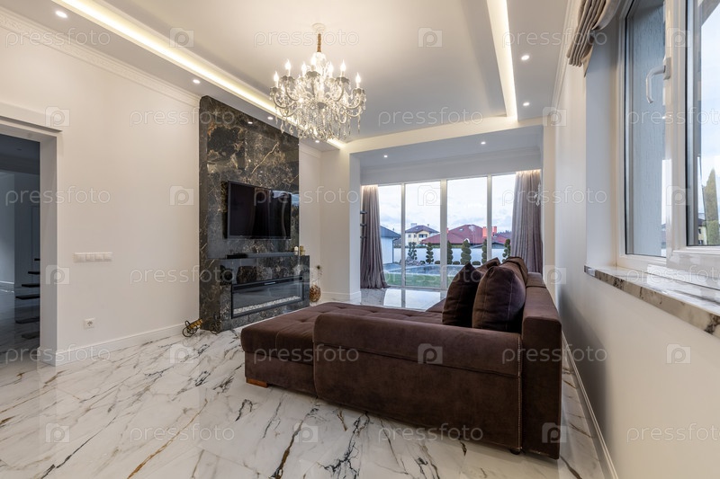 Просторная гостиная с большой люстрой, мраморным полом, мягким коричневым диваном и панорамным видом на сад