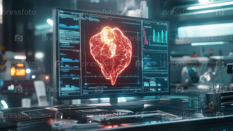 Цифровая визуализация мозга в форме сердца с анализом данных в высокотехнологичной лаборатории