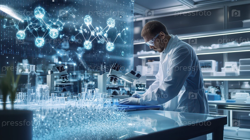 Ученый, работающий с передовыми технологиями и молекулярными данными в лаборатории
