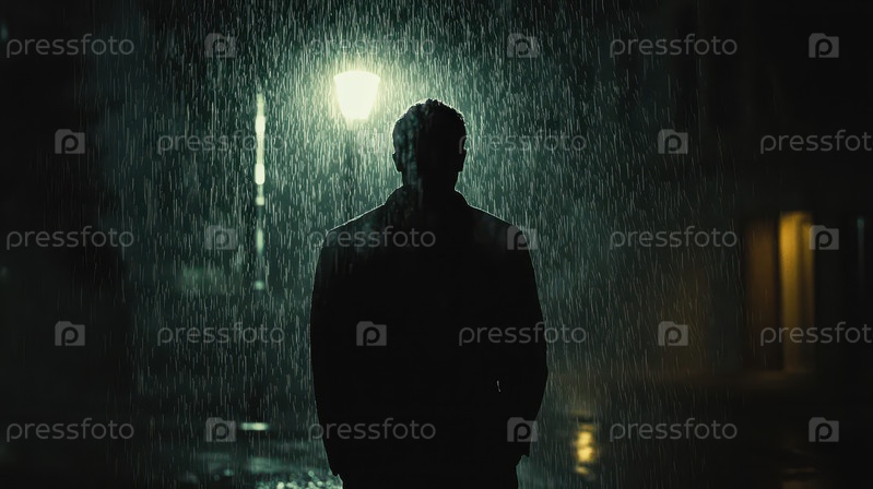 Таинственная фигура на улице в дождливую ночь под уличным фонарем