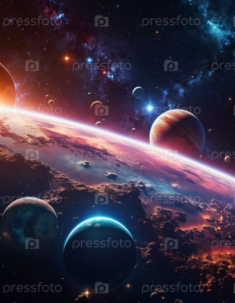 Планетарная система с несколькими планетами, большим ярко окрашенным газовым гигантом и каменистой планетой. Яркие звезды и огромное пространство темного космоса с галактикой на заднем плане. Космические просторы. Космонавтика. ИИ