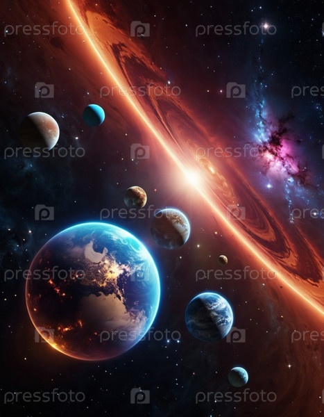 Планетарная система с несколькими планетами, большим ярко окрашенным газовым гигантом и каменистой планетой. Яркие звезды и огромное пространство темного космоса с галактикой на заднем плане. Космические просторы. Космонавтика. ИИ