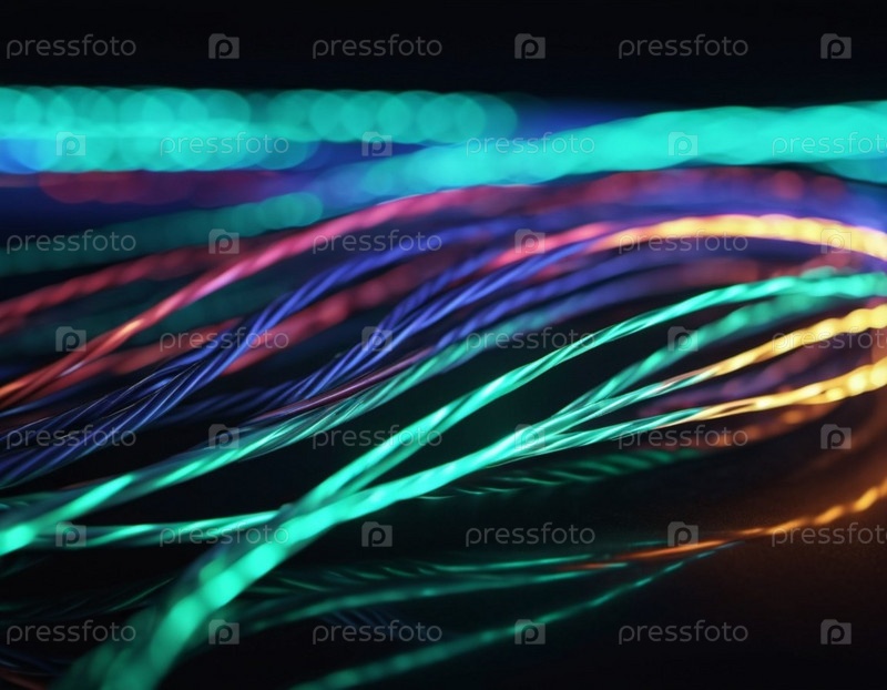 Синие и оранжевые светящиеся провода скручиваются и переплетаются на темном фоне с боке-огнями. Черные кабели и разъемы со светящимися огнями и цепями соединяются, образуя сеть. Создано с помощью ИИ