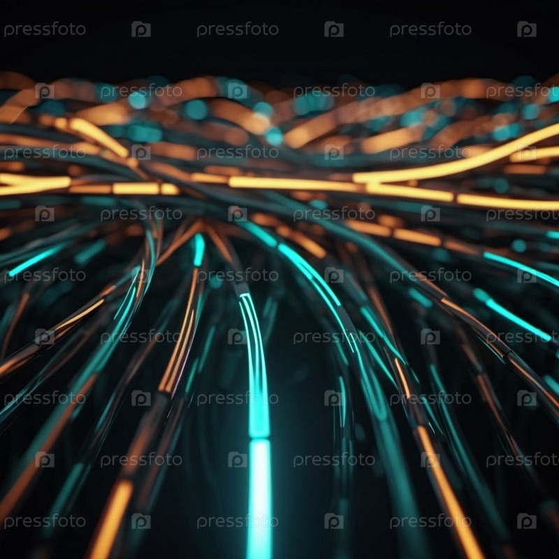 Синие и оранжевые светящиеся провода скручиваются и переплетаются на темном фоне с боке-огнями. Черные кабели и разъемы со светящимися огнями и цепями соединяются, образуя сеть. Создано с помощью ИИ