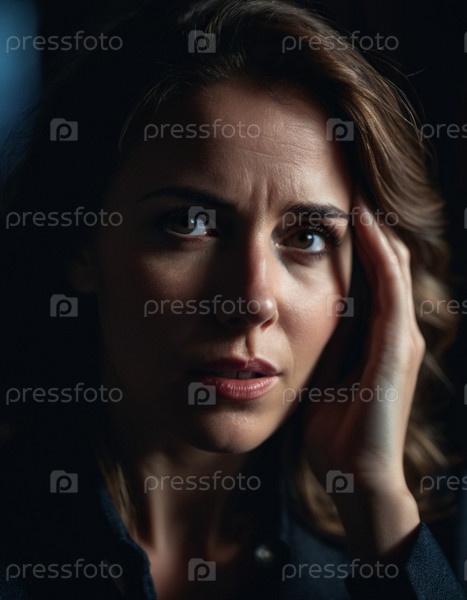 Женщина с нахмуренными бровями и обеспокоенным выражением лица смотрит прямо в камеру. Освещение тусклое, отбрасывает тени вокруг лица, подчеркивая ее стресс. Страх, разочарование, расстройство, беспокойство и задумчивость. ИИ