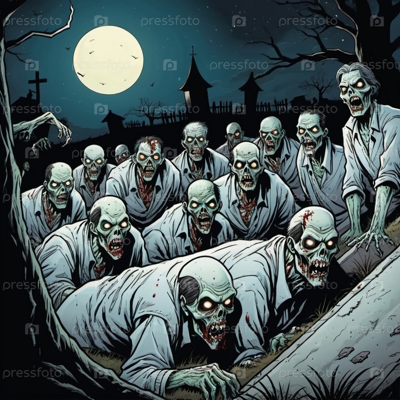 Ужасные комичные зомби появляются из могил, разложившиеся тела освещаются лунным светом. Скелетные фигуры бродят среди надгробий, в то время как другие ползают по земле, демонстрируя свой ужасный вид. ИИ