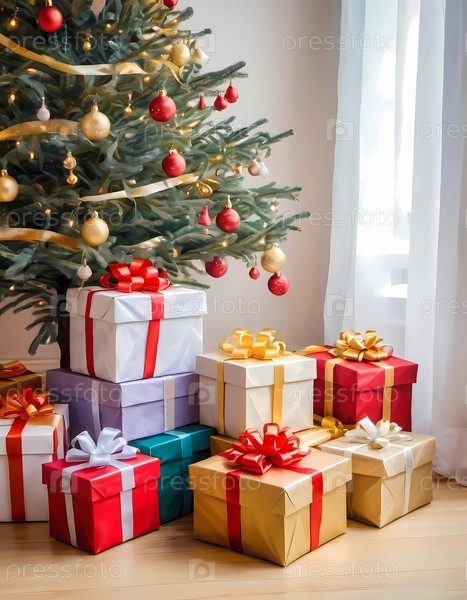 Декорированная рождественская елка, украшенная красочными игрушками и сложенными подарками, готова к празднованию в уютной праздничной обстановке. упакованные подарки разных цветов. Праздничная атмосфера, теплота и радость. AI