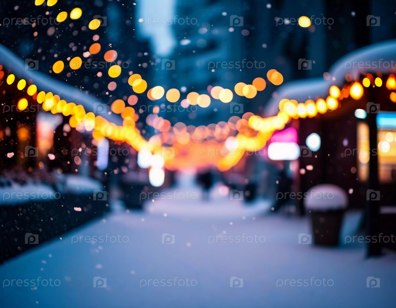 Зима приносит мягкий снегопад на городские улицы, где разноцветные огни висят над головой, создавая теплую и праздничную атмосферу. Эффект боке от огней добавляет причудливый штрих, подчеркивая радость сезона