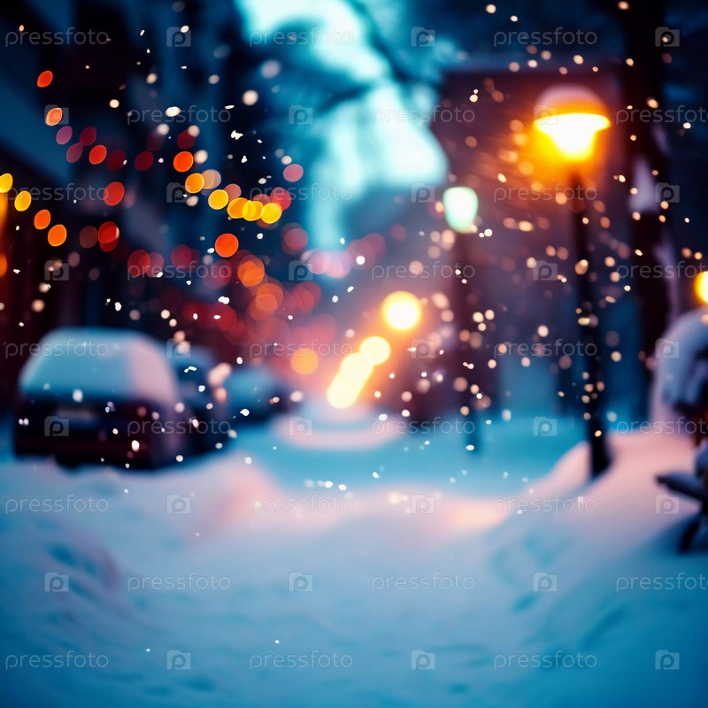 Зима приносит мягкий снегопад на городские улицы, где разноцветные огни висят над головой, создавая теплую и праздничную атмосферу. Эффект боке от огней добавляет причудливый штрих, подчеркивая радость сезона