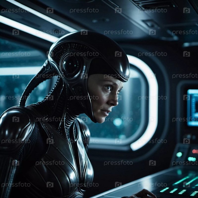 Встреча с инопланетянами на борту космического корабля, исследующего пустоту, с акцентом на члене экипажа, выражающем глубокую концентрацию во время навигации в космосе. Генеративный ИИ