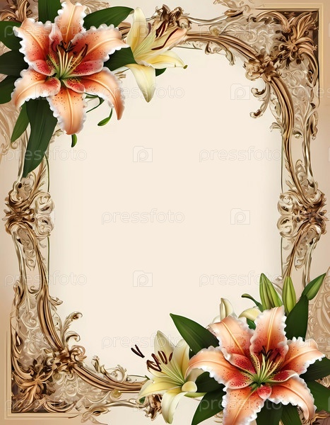 Этот декоративный дизайн демонстрирует красивую богато украшенную рамку, украшенную яркими лилиями. Идеально подходит для приглашений, объявлений или персонализированных сообщений, он добавляет элегантный штрих к любому проекту. Генеративный ИИ