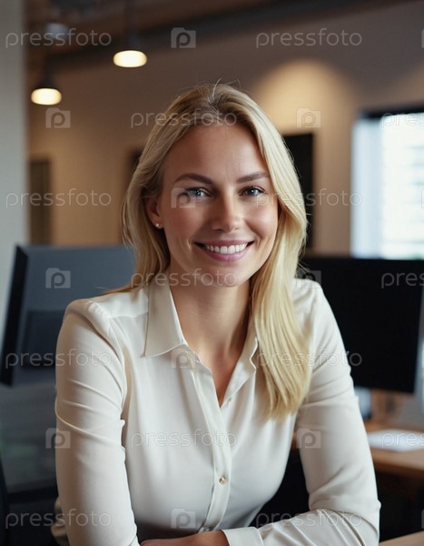 Профессиональная блондинка в белой рубашке сидит за своим столом в современном офисе, излучая уверенность и позитив. Окружающая среда усиливает ее доступное поведение. Генеративный ИИ