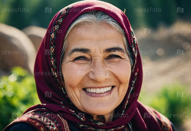 Зрелая таджикская женщина 75 лет улыбается, демонстрируя сложную традиционную одежду и богатое культурное наследие своей национальности, пробуждая мудрость и изящество