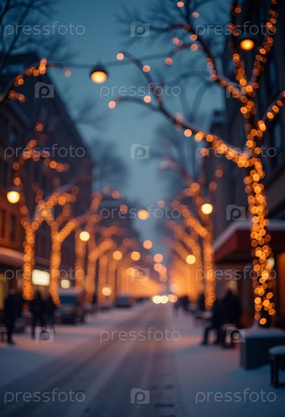 Тихий зимний вечер окутывает городскую улицу, где мягко падающий снег усиливает свечение рождественских огней. Праздничная атмосфера привлекает людей, празднующих Новый год. Генеративный ИИ