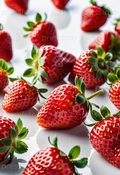 Гроздь свежей, ярко-красной клубники демонстрирует свой естественный блеск и уникальную текстуру, подчеркивая ее спелость и свежесть. Генеративный ИИ