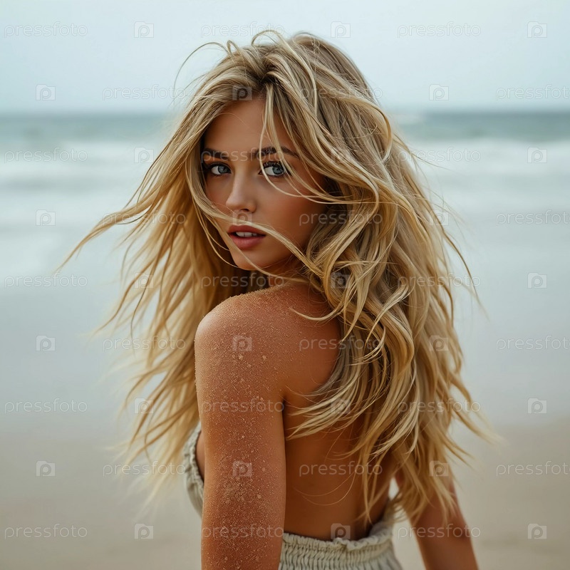 Блондинка в купальнике оглядывается назад, стоя у береговой линии. Нежные морские волны пляшут у ее ног под ясно-синим небом. Длинные волосы, красивое молодое лицо. Реклама путешествий и одежды. AI