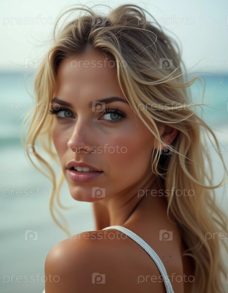 Блондинка в купальнике оглядывается назад, стоя у береговой линии. Нежные морские волны пляшут у ее ног под ясно-синим небом. Длинные волосы, красивое молодое лицо. Реклама путешествий и одежды. AI