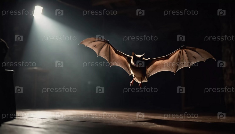 Летучая мышь, движется по темному коридору, наполненному теплым оранжевым светом. Атмосфера создает жуткую и напряженную атмосферу, усиливая таинственную атмосферу. Генеративный ИИ