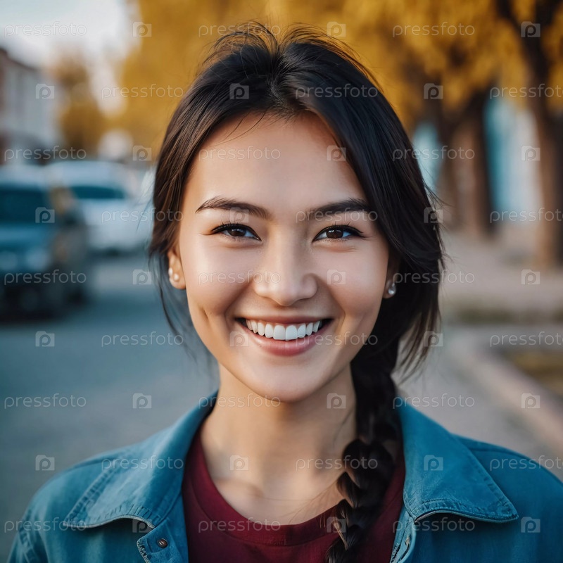Женщина 25 лет выражает свое счастье яркой улыбкой, стоя на улице в оживленной городской обстановке, греясь в теплых солнечных лучах после полудня. Жительница Казахстана. Создано ИИ