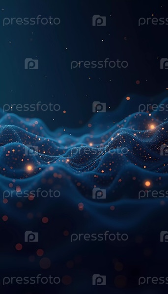 Композиция включает в себя плавные синие линии и светящиеся узлы, которые представляют сложные взаимодействия больших данных в цифровой среде. Футуристический вид подчеркивает технологию и связь. ИИ