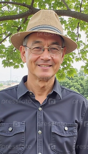 Мужчина из Таиланда стоит на улице, в соломенной шляпе и очках, тепло улыбаясь в камеру среди зелени. Кажется, что сегодня солнечный день, что подчеркивает его расслабленное поведение. Генеративный ИИ