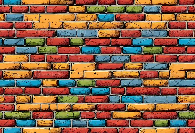 Эта яркая кирпичная стена демонстрирует множество цветов, включая красный, желтый, бирюзовый и фиолетовый. Дизайн отражает художественный подход, часто встречающийся в городской среде. Генеративный ИИ
