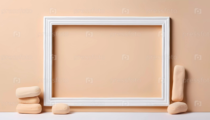 Белая рамка на бежевом фоне, окруженная мягкими бежевыми фигурками из пластилина. Эта обстановка подчеркивает креативность и минималистский дизайн
