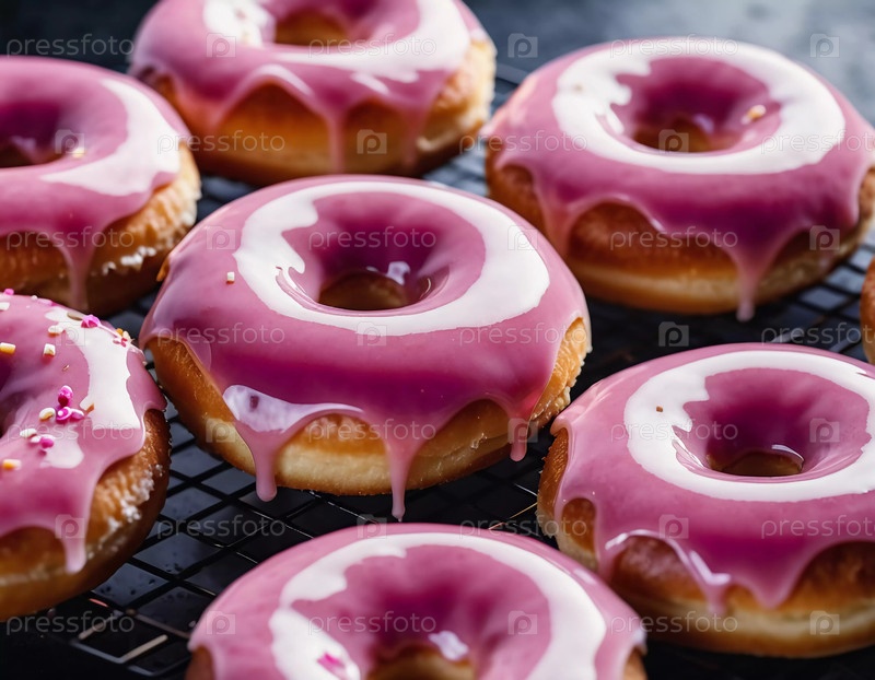 Очаровательные пончики с розовой клубничной глазурью выставлены на деревенском деревянном фоне. Посыпка и украшения из конфет добавляют яркие цвета, создавая праздничное угощение. Генеративный ИИ