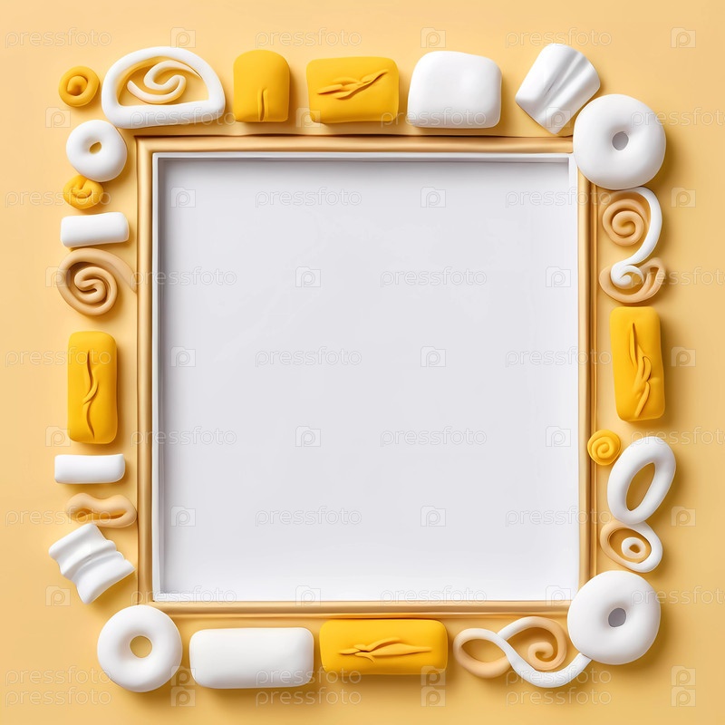 Прямоугольная рамка, украшенная игривыми фигурами белого и золотисто-желтого цветов, выделяется на ярком золотисто-желтом фоне, добавляя очаровательный штрих любому интерьеру
