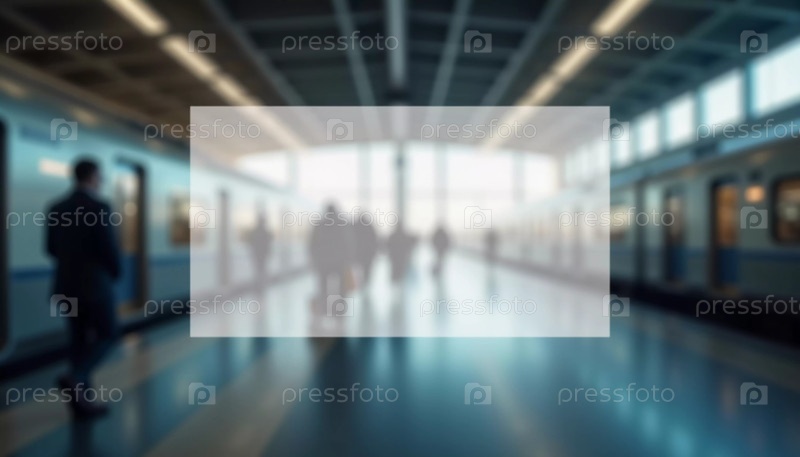 Пассажиры перемещаются по просторному вокзалу, окруженному полупрозрачным космическим фоном, ожидая свои поезда ярким утром, сливаясь с атмосферой. Генеративный ИИ