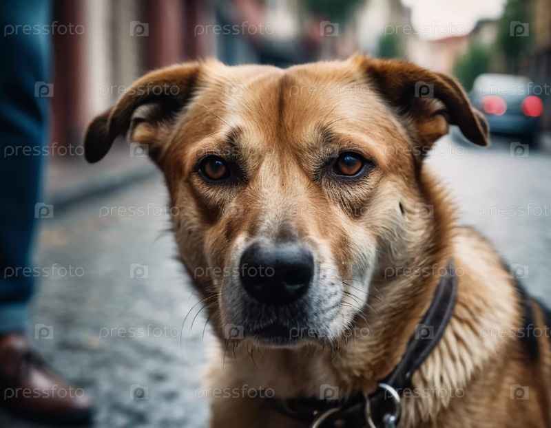 Собака с выразительными глазами стоит на асфальтированной дороге, любопытно осматривая окрестности.Город оживает в мягком свете уличных фонарей и далеких звуках вечерней активности AI