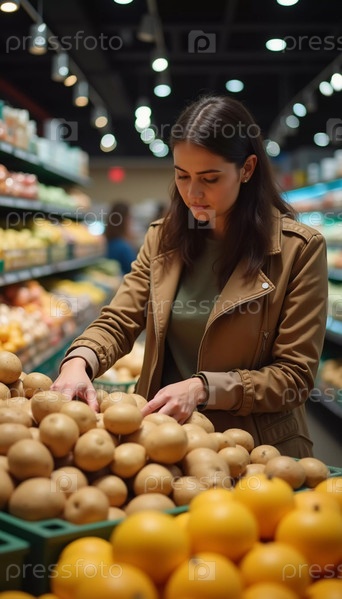 Под ярким светом женщина внимательно рассматривает кучу свежего картофеля в супермаркете. Яркие цвета фруктов и овощей окружают ее, создавая оживленный опыт покупок