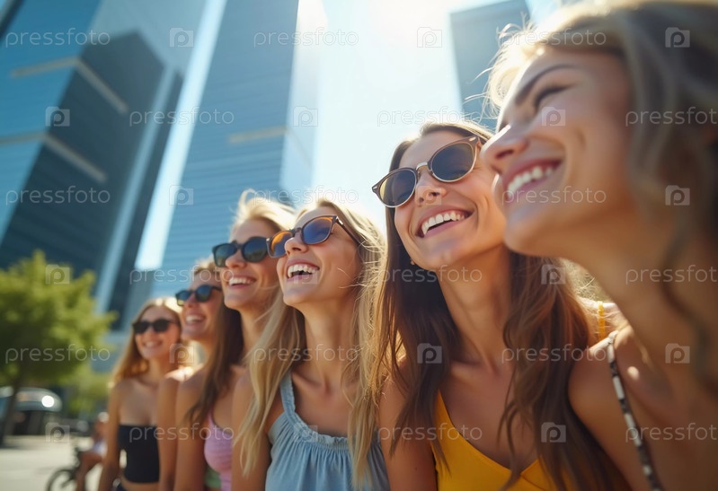 Группа друзей наслаждается солнечным днем, смеясь и улыбаясь, стоя вместе перед возвышающимися стеклянными зданиями. Их радость излучается, отражая суть дружбы и приключений