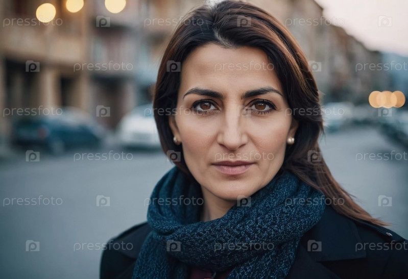 С твердым взглядом армянская женщина стоит посреди своего оживленного района в сумерках, излучая силу, в то время как на заднем плане начинают мерцать городские огни