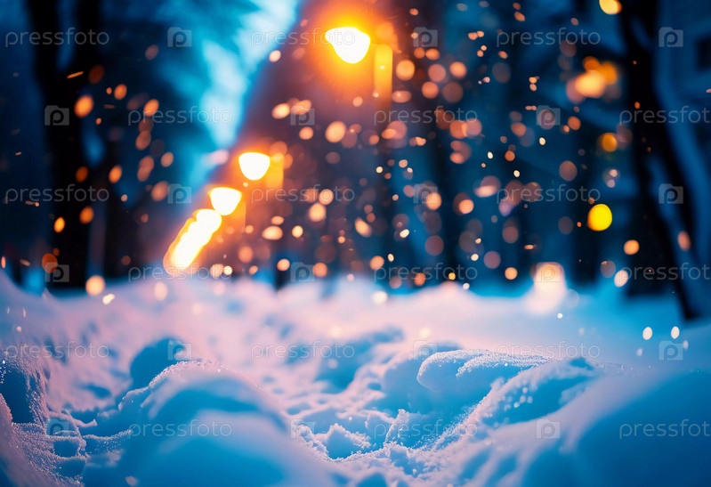 Зима приносит мягкий снегопад на городские улицы, где разноцветные огни висят над головой, создавая теплую и праздничную атмосферу. Эффект боке от огней добавляет причудливый штрих, подчеркивая радость сезона