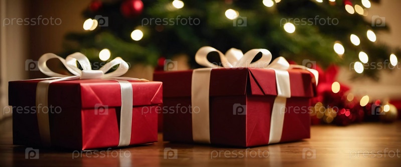 Уютная гостиная, украшенная праздничной рождественской елкой, украшенной сверкающими огнями и красочными безделушками, окруженная множеством тщательно упакованных подарочных коробок, ожидающих открытия. Искусство ИИ