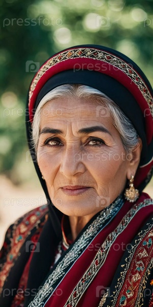 Зрелая 75-летняя таджикская женщина смотрит прямо, демонстрируя сложную традиционную одежду, богатое культурное наследие своей национальности, пробуждая мудрость и изящество