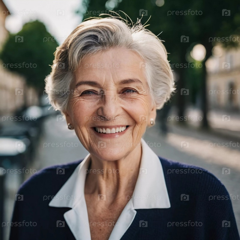 Утонченная улыбающаяся пожилая француженка на открытом воздухе. манера поведения раскрывает жизненный опыт и размышления, воплощая изящество и мудрость. ухоженная женщина 70 лет с седыми волосами