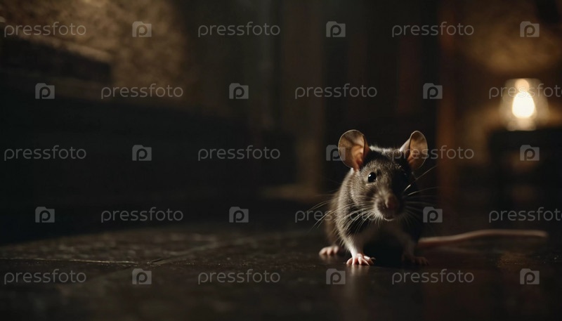 Маленькая крыса перемещается по темному пространству, освещенному мерцающей лампой. Усы дергаются, когда она исследует окрестности в поздние часы. Страшная атмосфера вампира или Хэллоуина. Генеративный ИИ