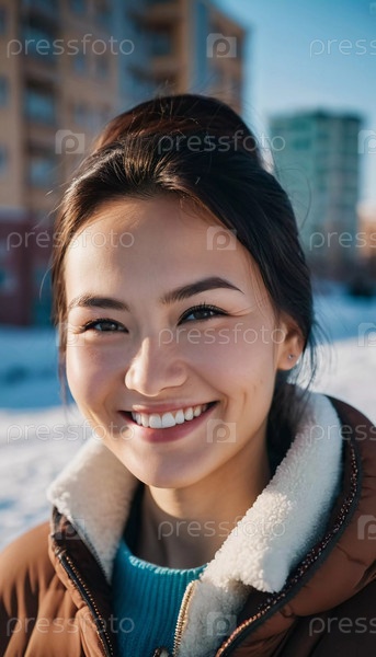 Женщина 25 лет выражает свое счастье яркой улыбкой, стоя на улице в оживленной городской обстановке, греясь в теплых солнечных лучах после полудня. Жительница Казахстана. Создано ИИ