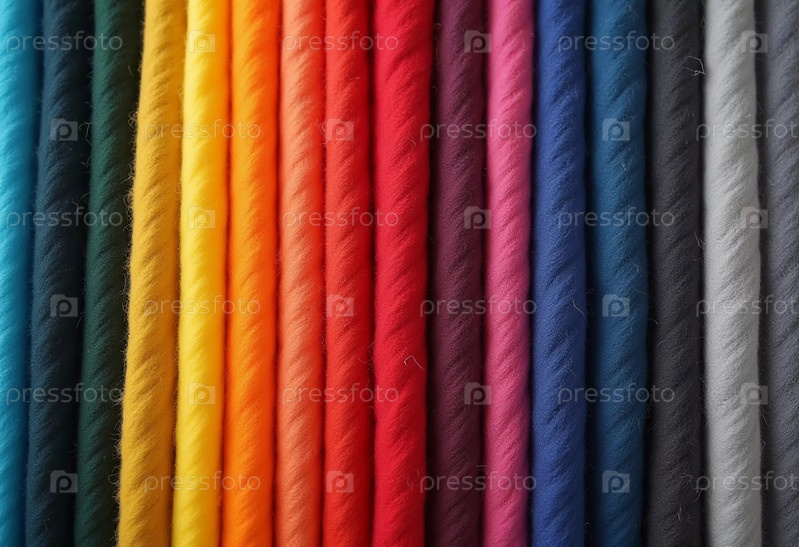 Различные образцы шерстяной ткани разных цветов аккуратно организованы, демонстрируя яркую палитру, идеально подходящую для текстильного дизайна и творческих проектов. Генеративный ИИ