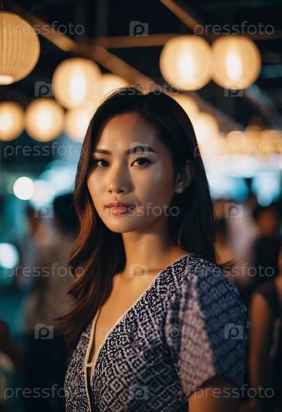Жительница Таиланда грациозно стоит на вечернем рынке, демонстрируя традиционную одежду