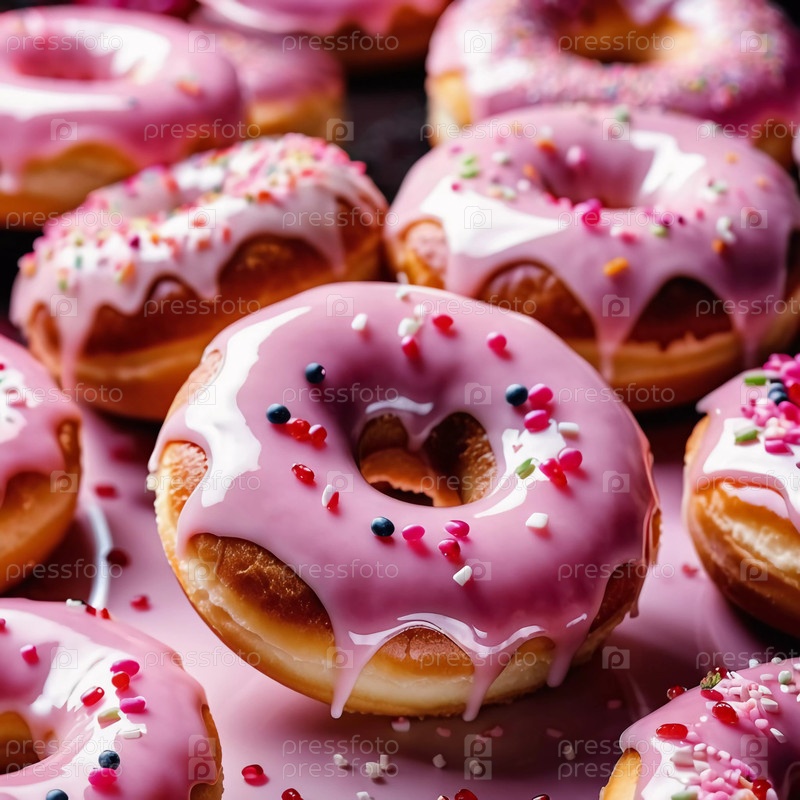 Очаровательные пончики с розовой клубничной глазурью выставлены на деревенском деревянном фоне. Посыпка и украшения из конфет добавляют яркие цвета, создавая праздничное угощение. Генеративный ИИ