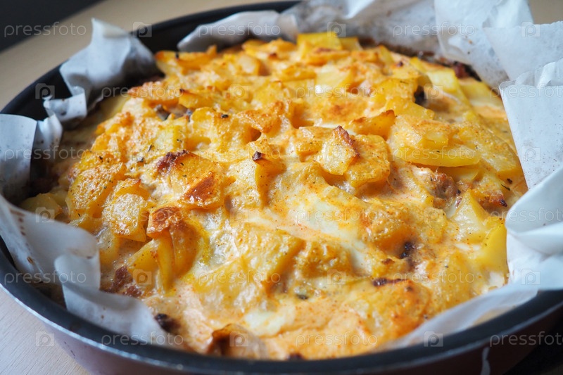 Мусака — балканское блюдо из печи. Картофель, свиной фарш, жареный лук слоями. Йогурт или сметана, смешанная с яйцами, запеченная сверху. Противень с мусакой на бумаге для выпечки. Сербский вариант приготовления