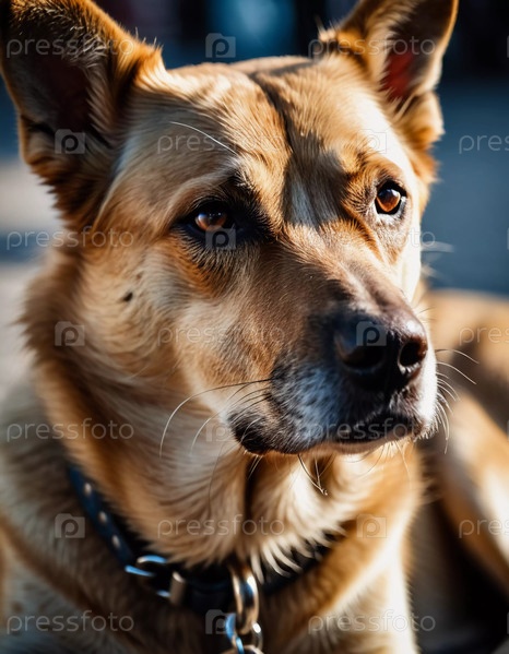 Душевная собака отдыхает на тротуаре, глаза отражают жизнерадостность города, когда мимо проходят люди.Теплый свет сумерек окутывает сцену, создавая спокойную, но живую атмосферу AI