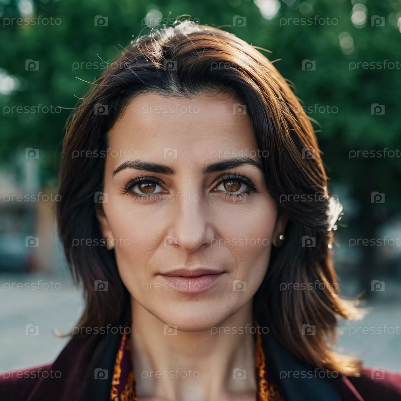 Уверенная в себе армянка стоит в оживленном дворе, ее черты лица освещают тепло дня. Фон из зеленых деревьев добавляет глубины и жизни ее присутствию